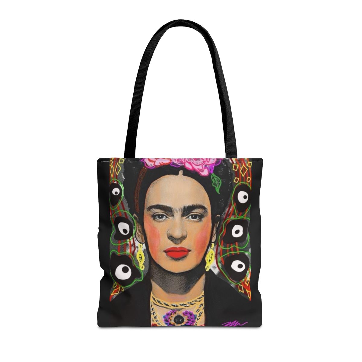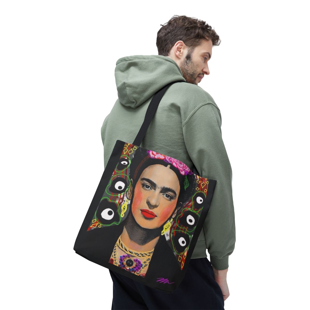 The Frida Khalo 16x16 Tote Bag features a durable construction designed for everyday use, complemented by black handles for enhanced comfort and stability. Its size offers ample storage capacity, making it suitable for various activities, from grocery shopping to daily commutes.